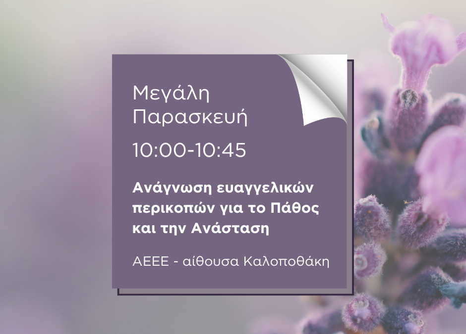 Προετοιμαζόμαστε για τη λατρεία της Μεγάλης Παρασκευής με αναγνώσματα ευαγγελικών περικοπών για το Πάθος και την Ανάσταση του Κυρίου μας Ιησού Χριστού. Ξεκινάμε στις 10:00 στην αίθουσα Καλοποθάκη.